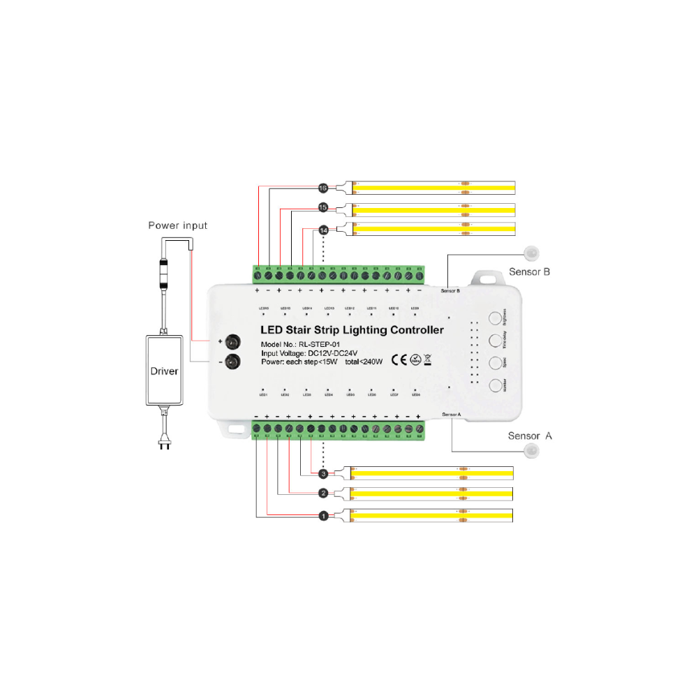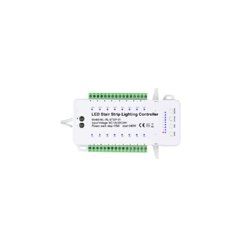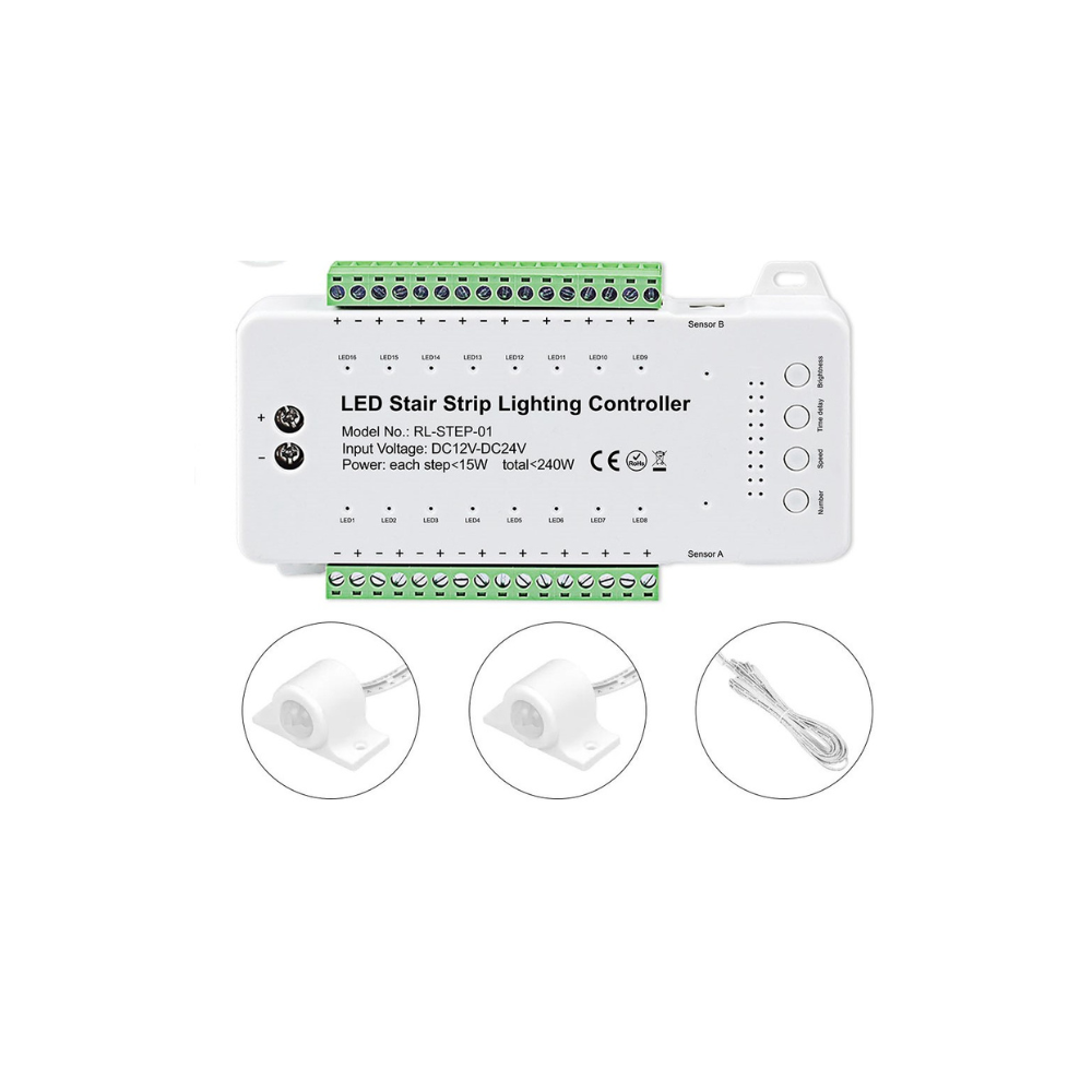 StepChase Motion Sensor Kit is a smart stair step-lighting control system that turns lights on step-by-step as motion is detected—creating a clean, modern “follow-me” effect for safer stairs. It supports up to 16 step lights, with 240W max total load and 15W max per light, making it ideal for residential and commercial staircases where style, safety, and smart technology matter.